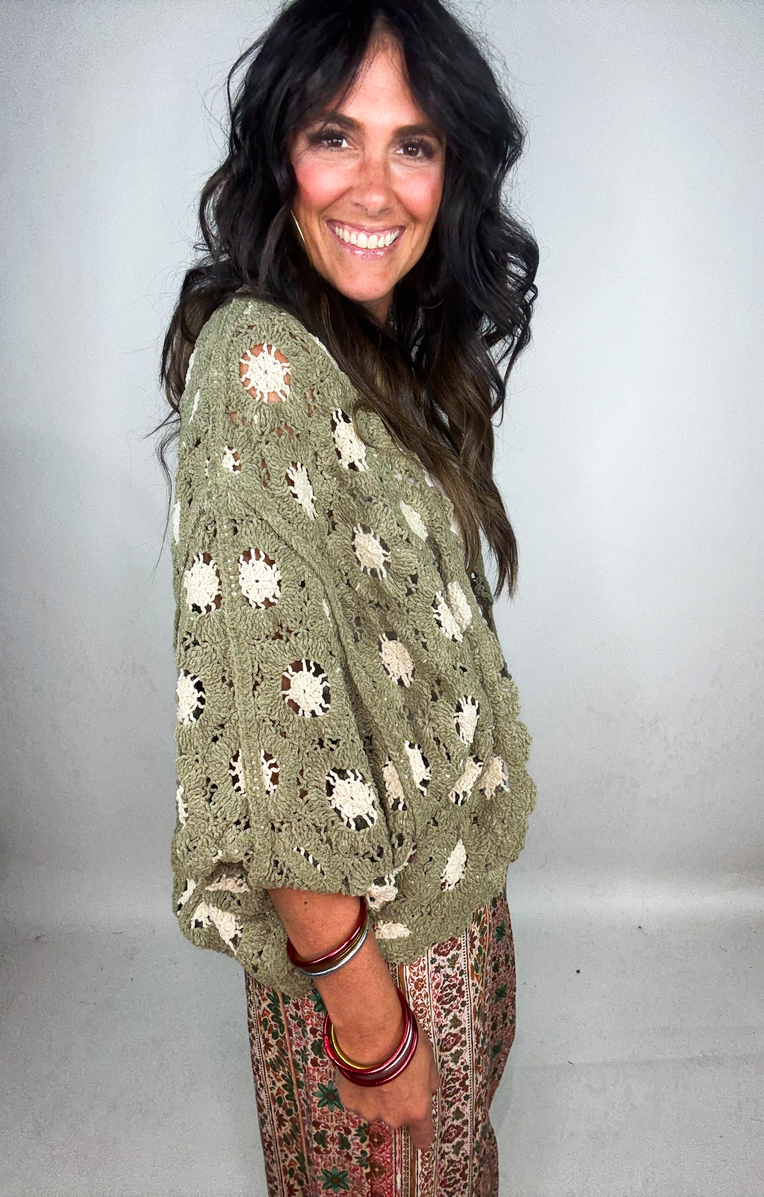 Wrap yourself in laid-back boho vibes with this crochet open-front cardigan. Designed with a soft, airy knit and an easy draped fit, it’s the perfect layering piece for every season. The earthy olive hue is accented with ivory floral crochet details, giving it a vintage-inspired charm that pairs effortlessly with dresses, denim, or wide-leg pants. Lightweight yet cozy, this cardigan is your go-to for adding texture and style to any outfit.
