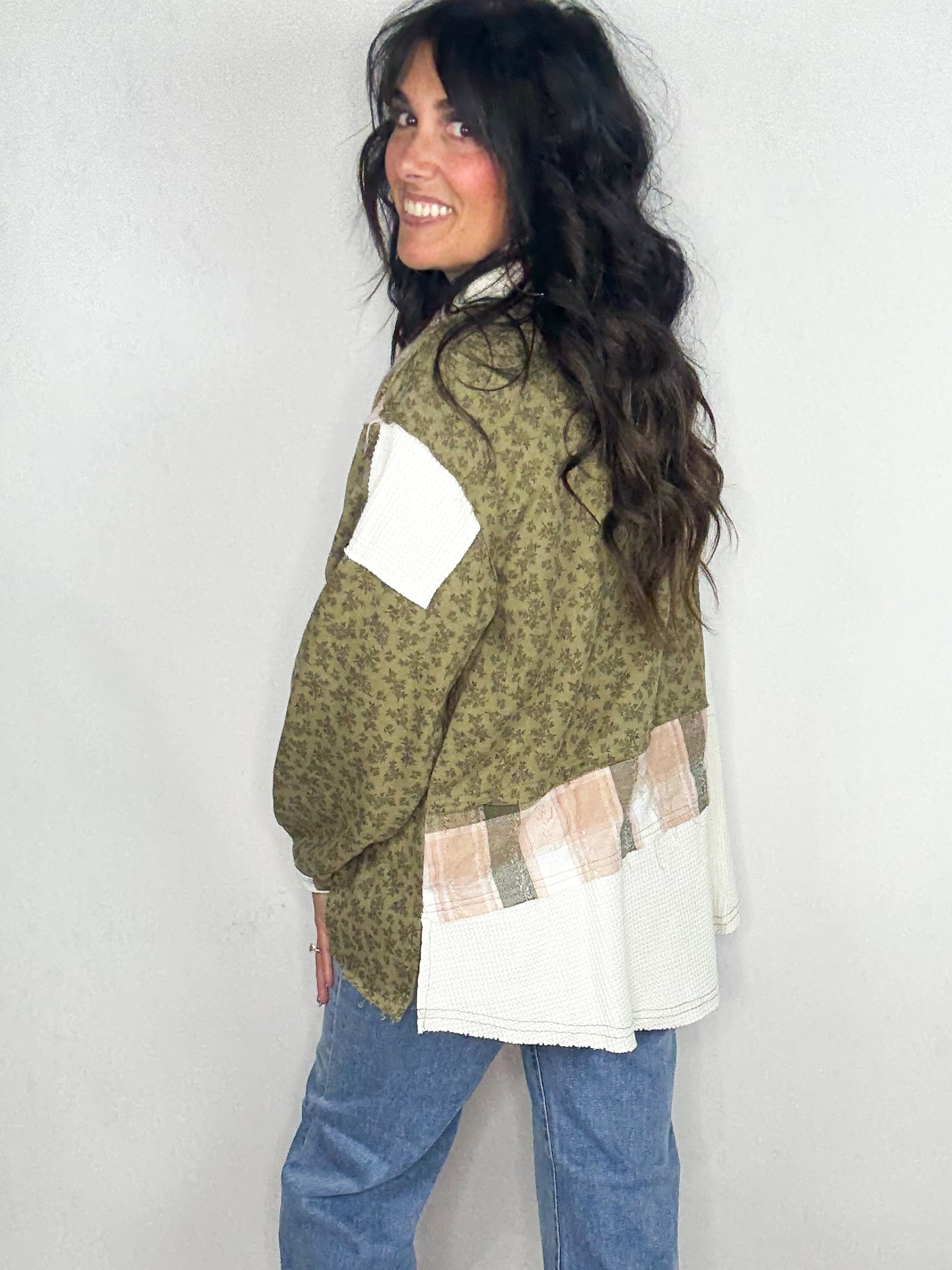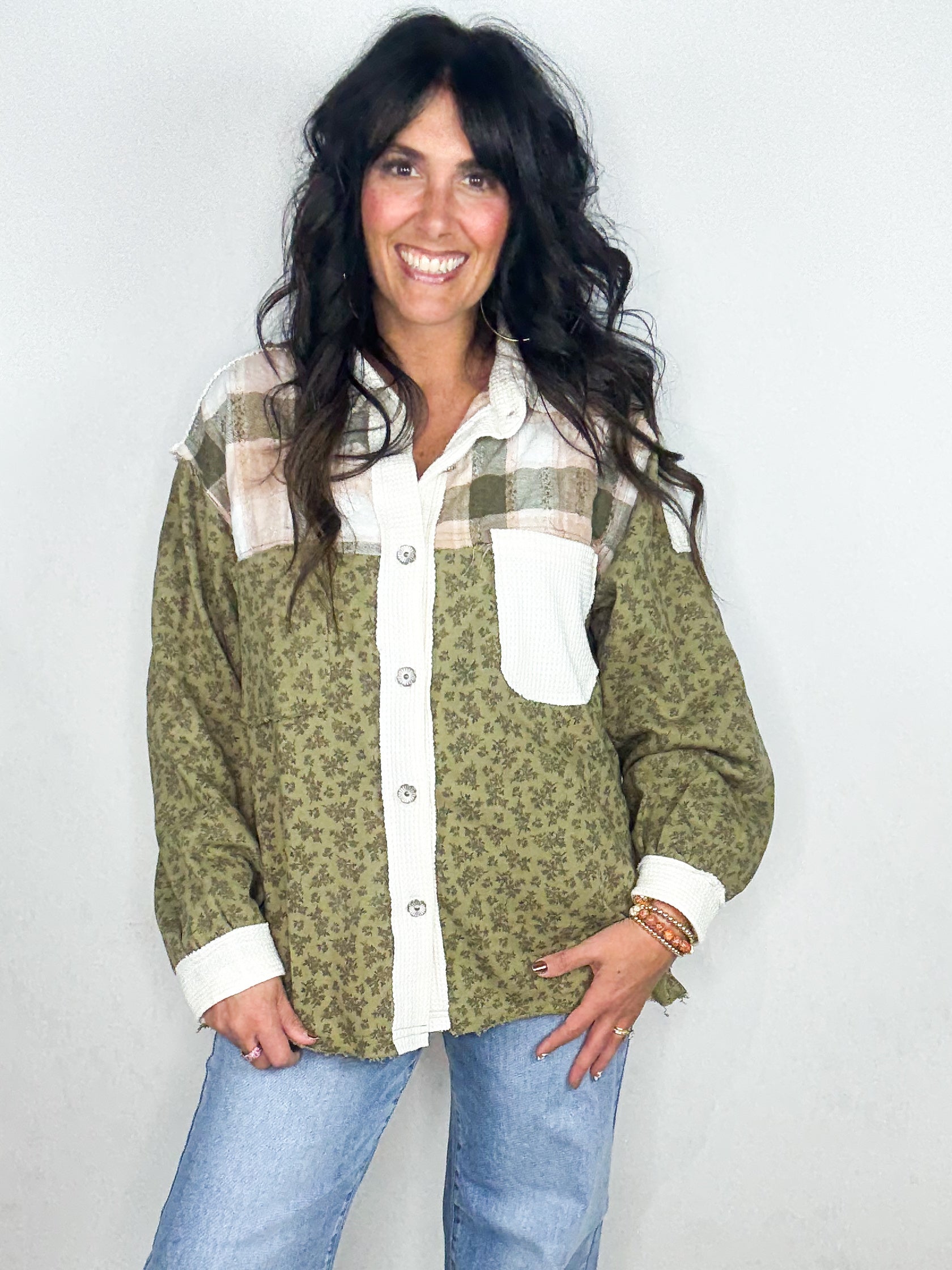 - 🌿 Green floral button-down shirt with a fresh, vibrant vibe