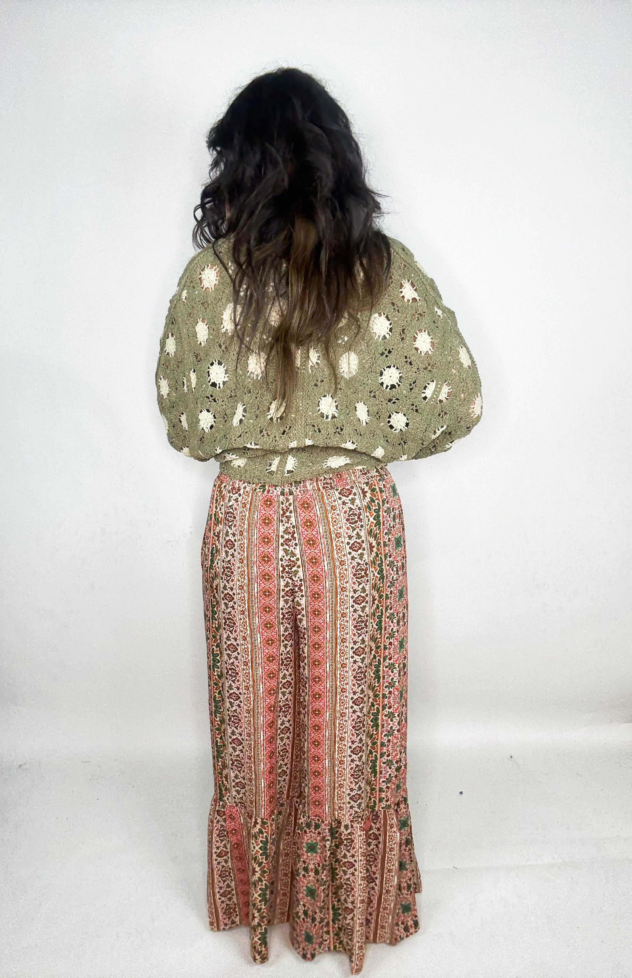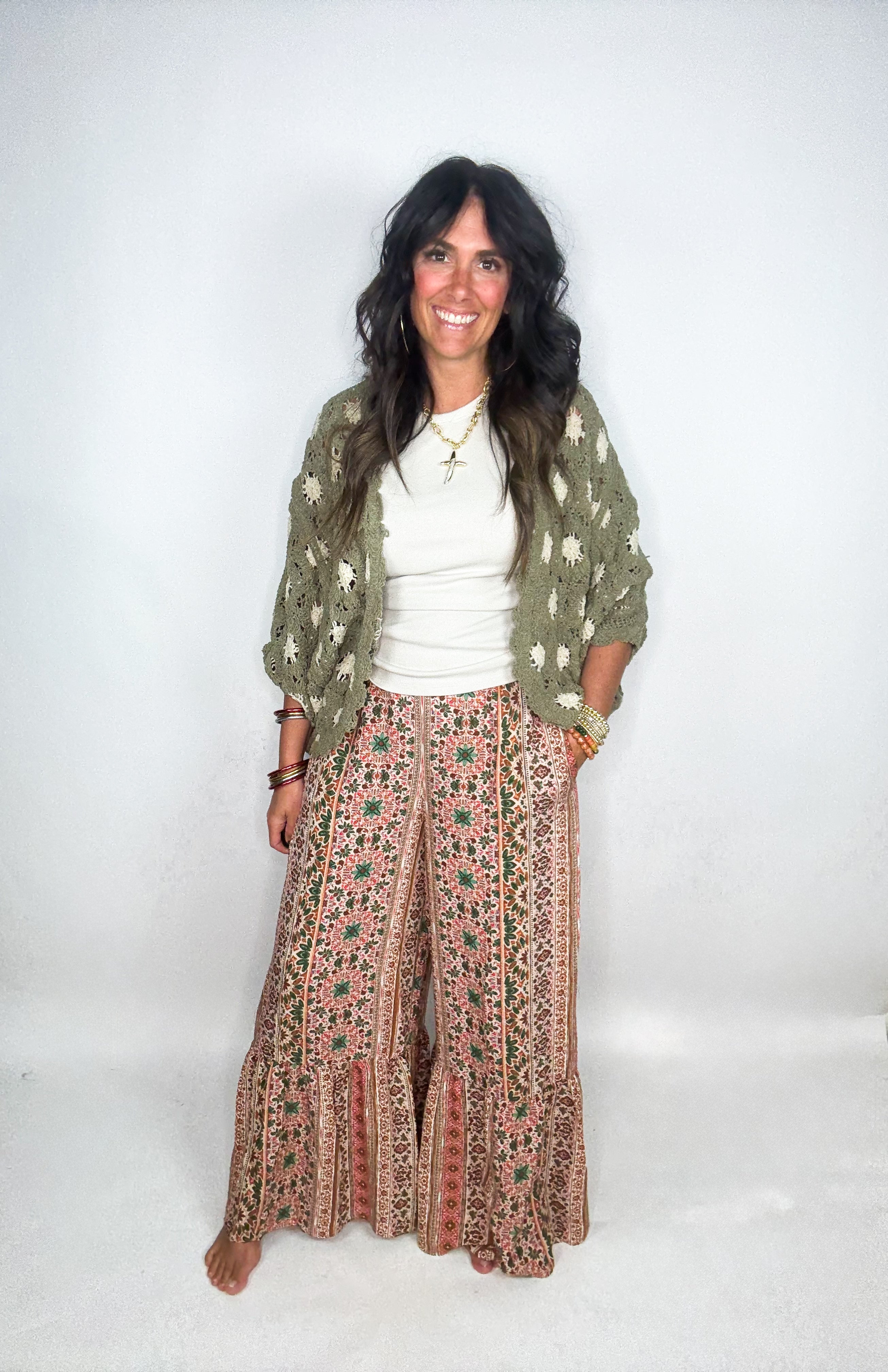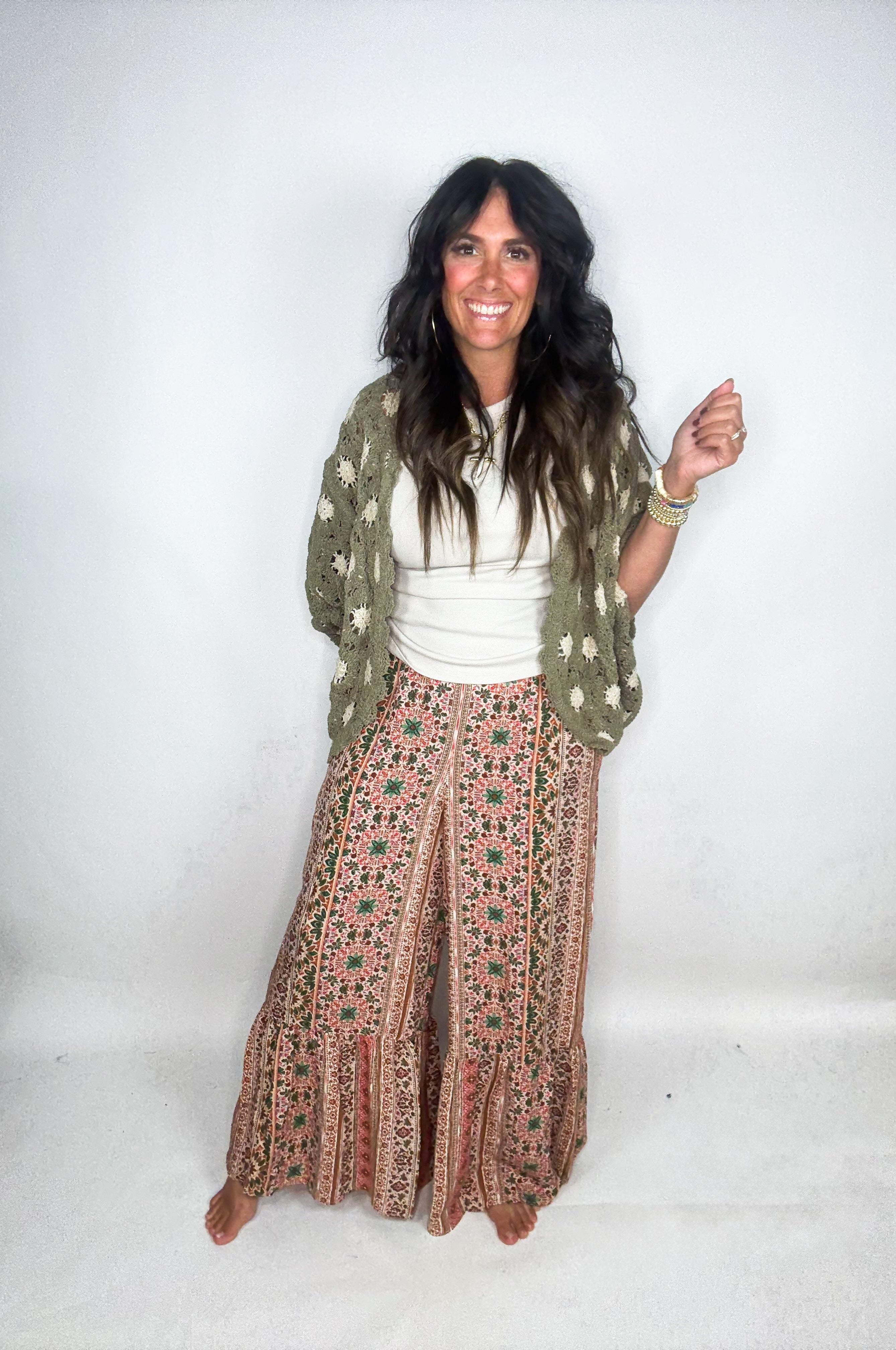 Bring effortless charm to your wardrobe with these boho-inspired wide-leg pants. Featuring a soft, flowy silhouette and a gorgeous allover floral print in earthy tones, these pants are as comfortable as they are eye-catching. The lightweight fabric drapes beautifully, while the tiered hem detail adds a playful touch. Perfect for pairing with a simple tee, a cozy cardigan, or a breezy blouse, these pants will take you from lounging at home to weekend adventures in style.