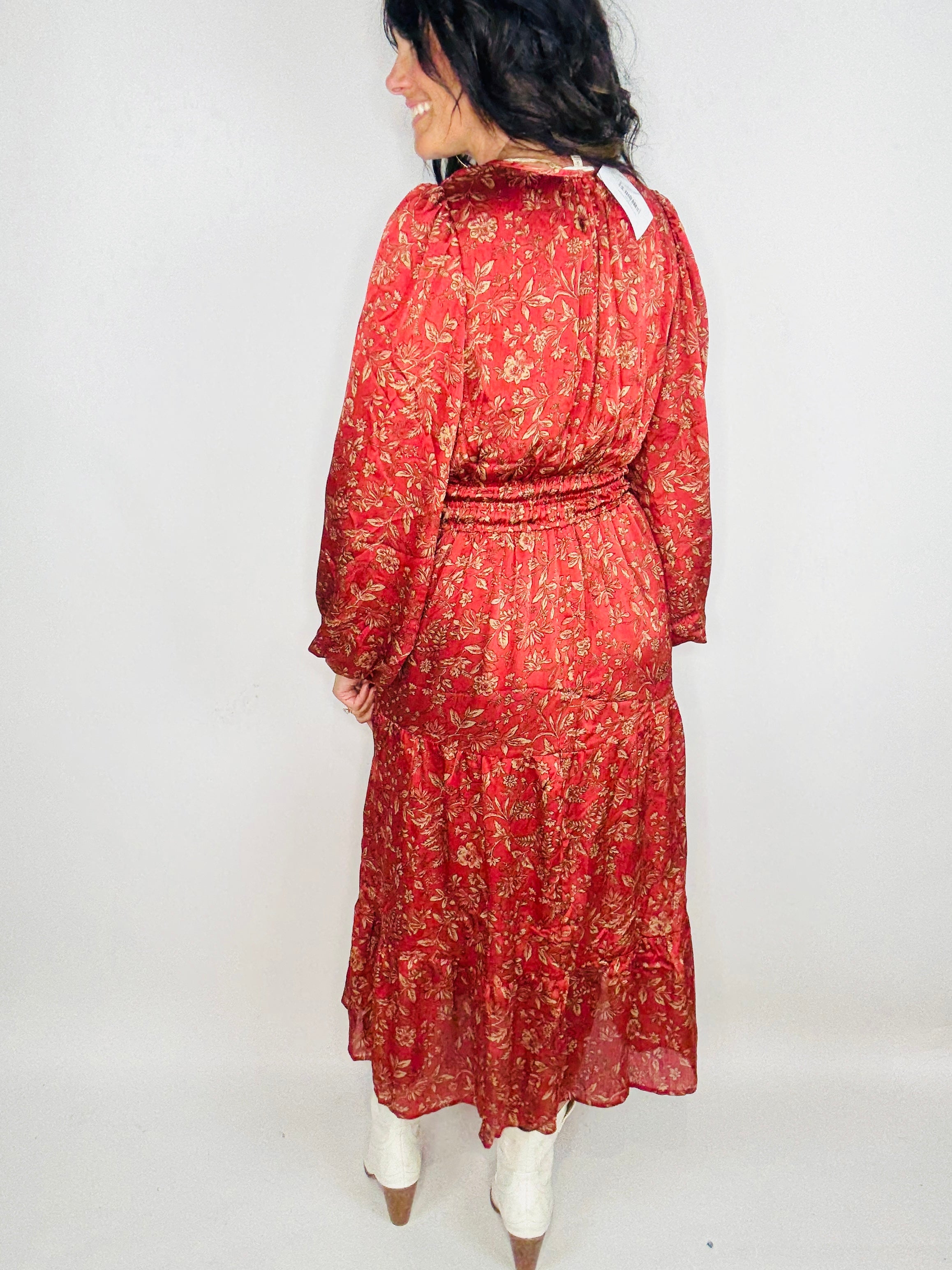 Feminine, flattering, and effortlessly timeless—this rust-toned midi dress is sprinkled with a delicate golden floral print for the perfect touch of romance. Featuring a flattering V-neckline, long blouson sleeves, and a matching tie belt to cinch the waist, this dress transitions beautifully from casual day outings to dressed-up evenings. The soft, flowy fabric and tiered skirt give it an easy elegance you’ll reach for again and again.
