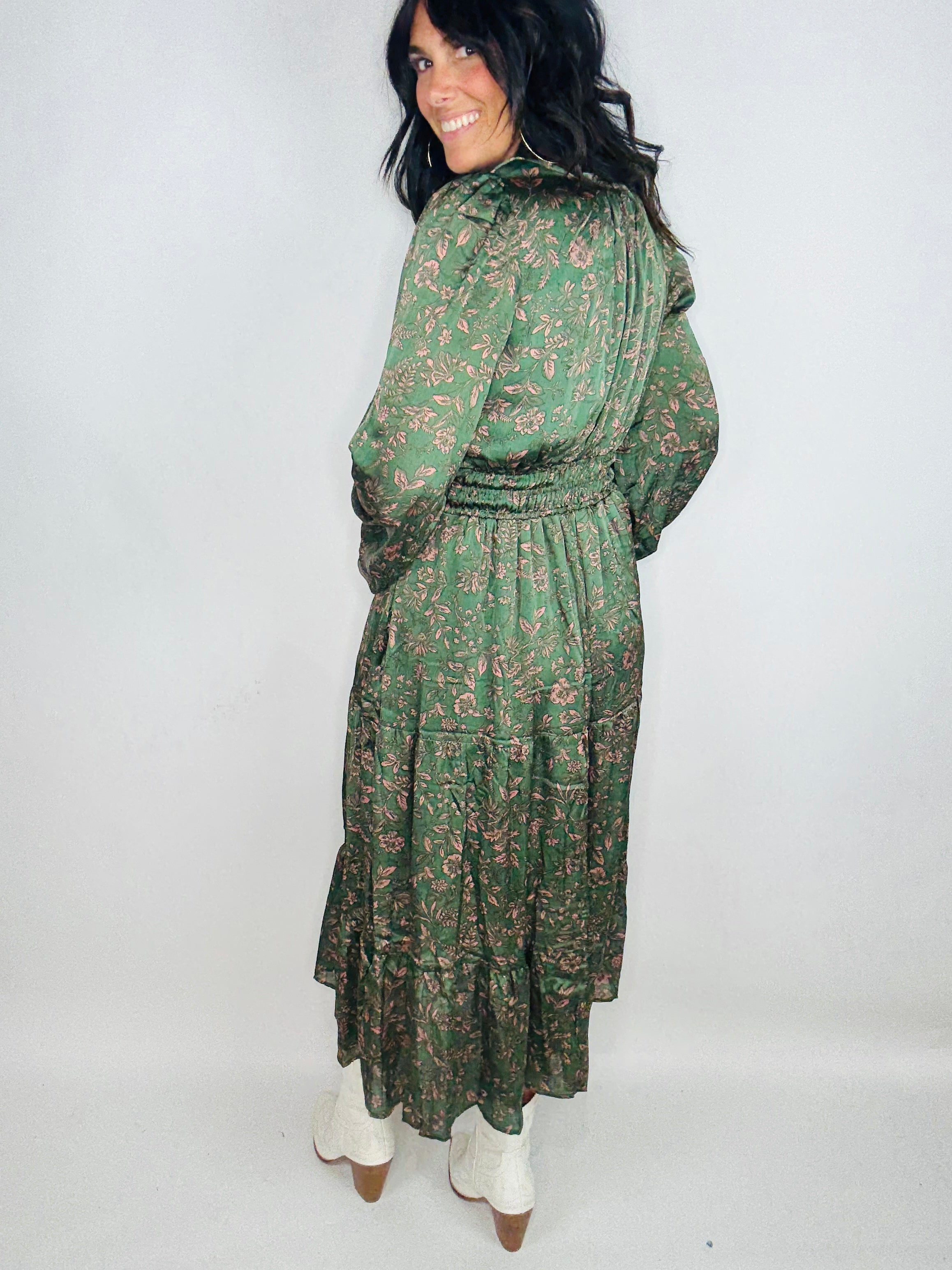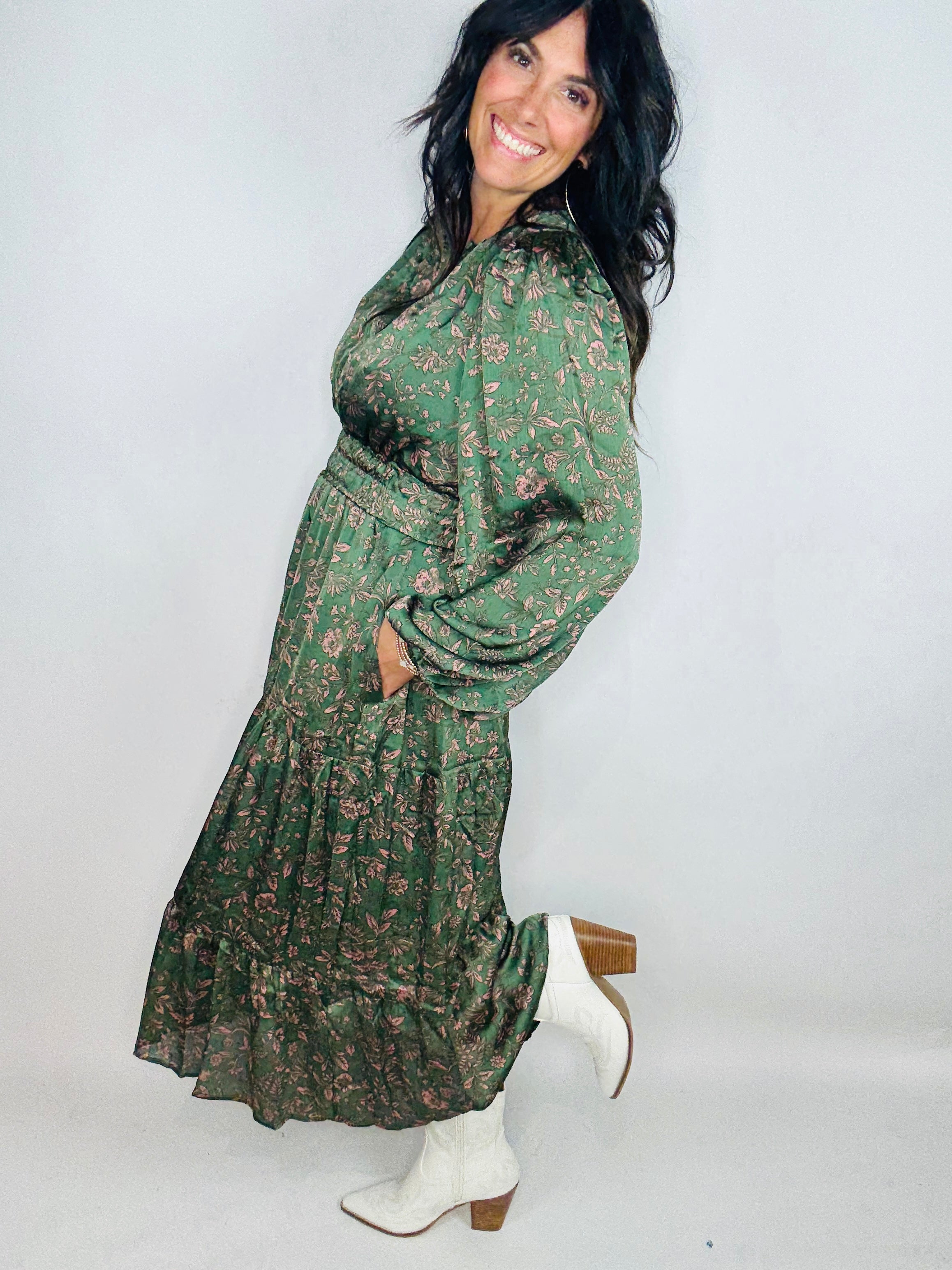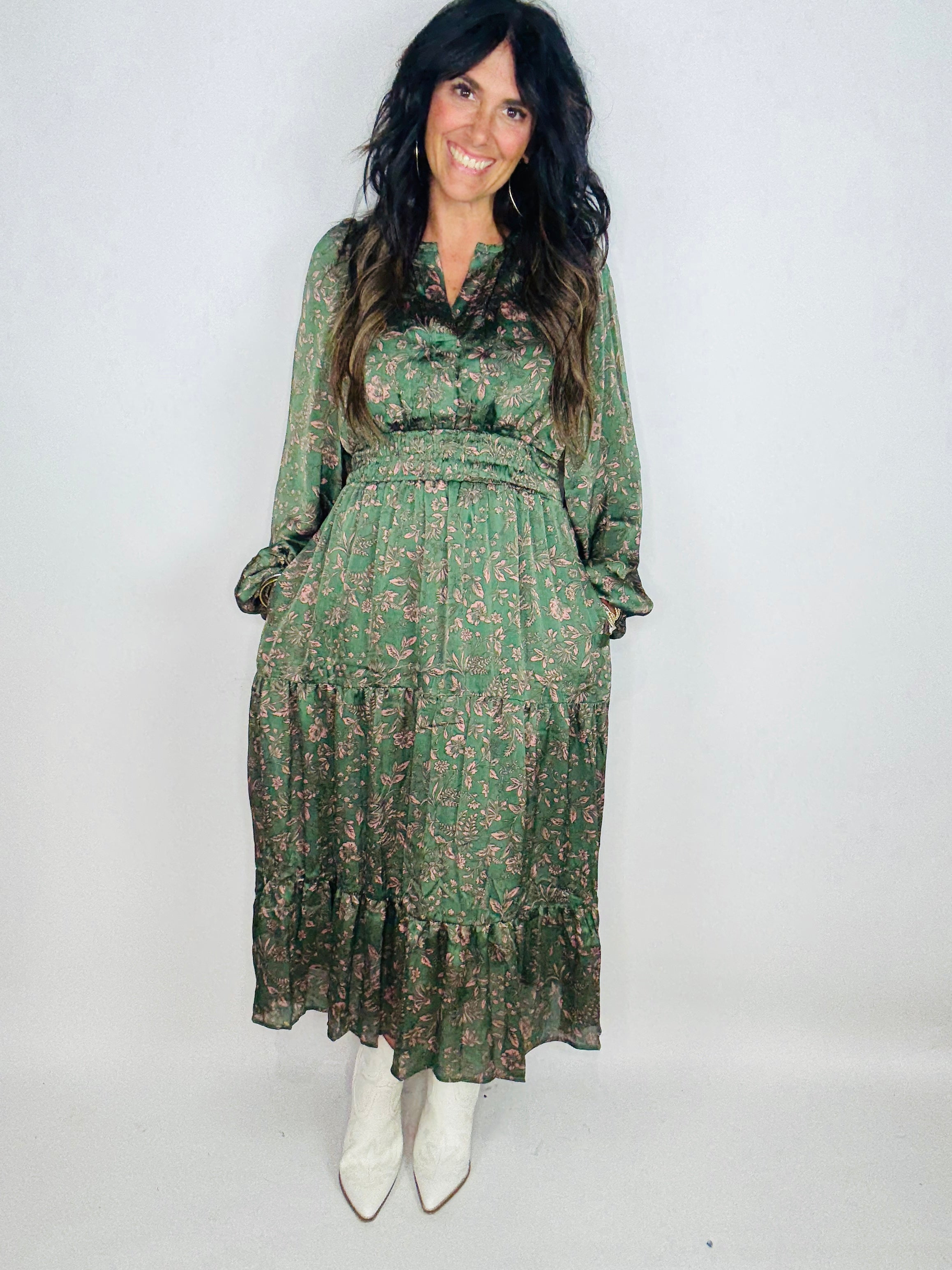 Step into effortless elegance with this flowy green floral maxi dress. Designed with a flattering empire waist, tiered skirt, and button-down bodice, this dress blends comfort with timeless charm. The soft floral pattern gives it a romantic touch, while the lightweight fabric makes it perfect for year-round wear. Pair it with boots for a boho-chic look or sandals for an easy daytime outfit.