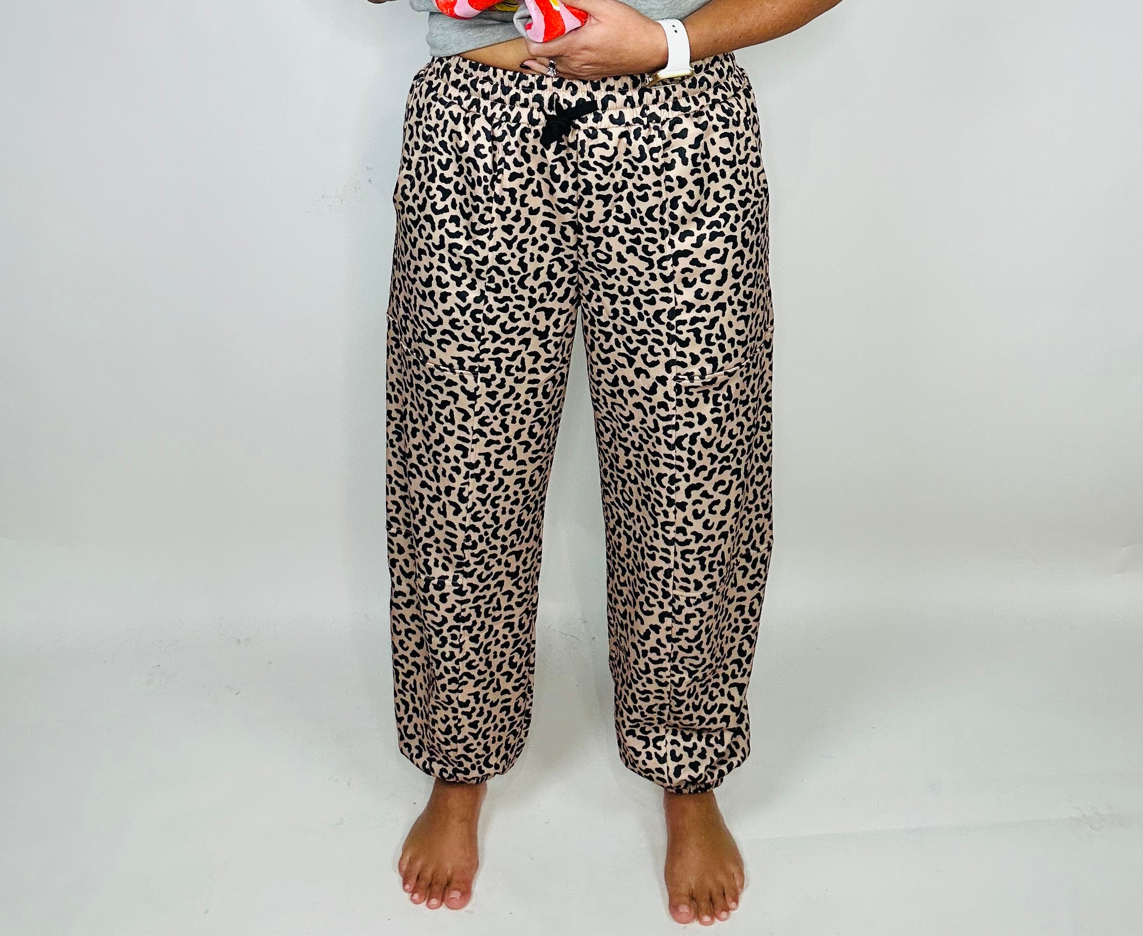 - Details: Cuffed ankles, all-over leopard print