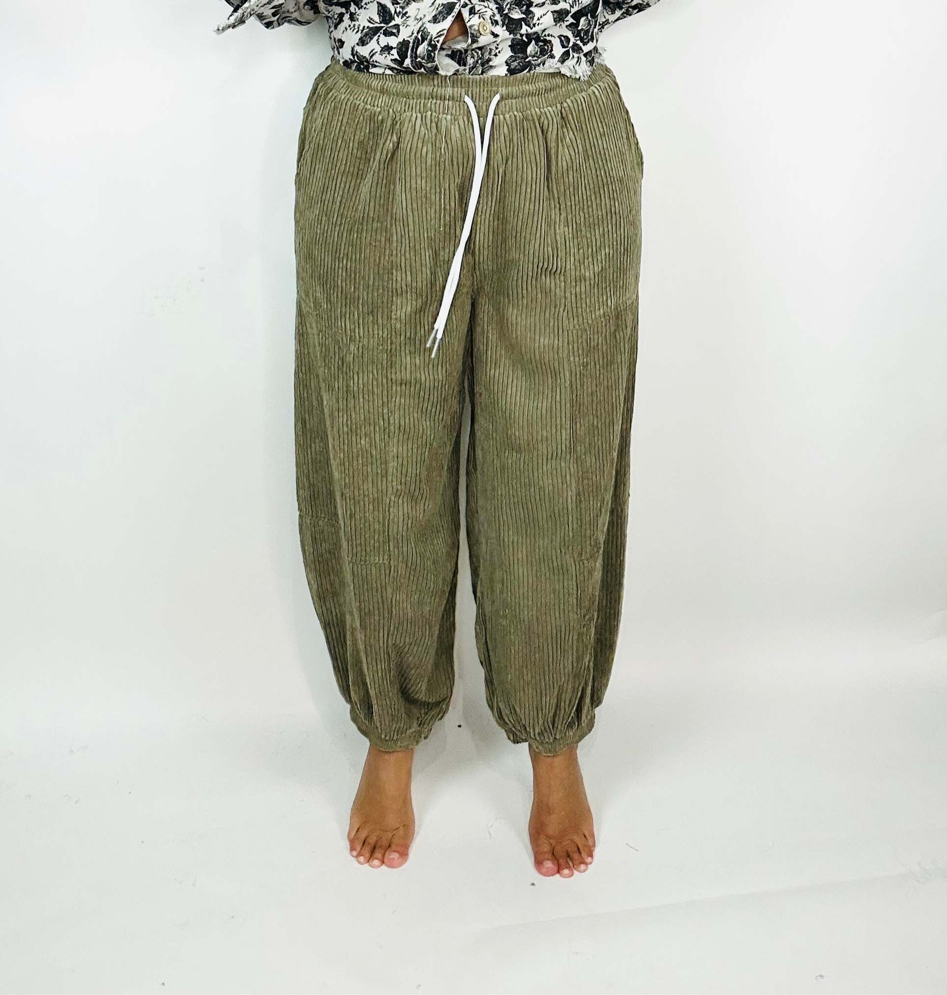 Comfy meets effortlessly cool! These olive corduroy pants feature a relaxed, slouchy fit with a soft textured feel. Designed with an adjustable drawstring waist and elasticized cuffs, they’re perfect for lounging in style or dressing up with a chic blouse. A must-have staple for cozy yet trendy vibes!