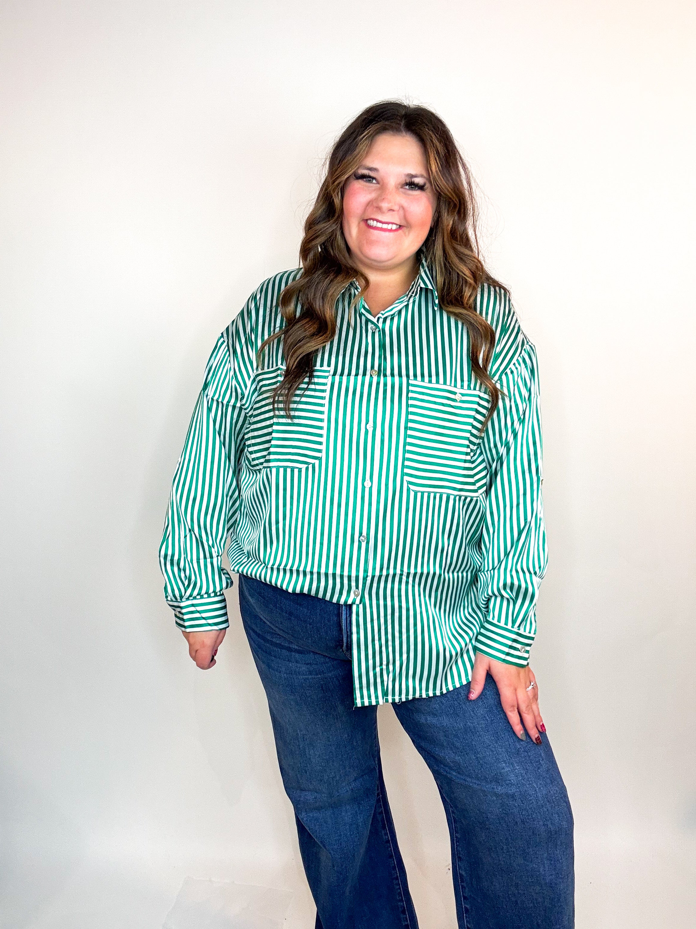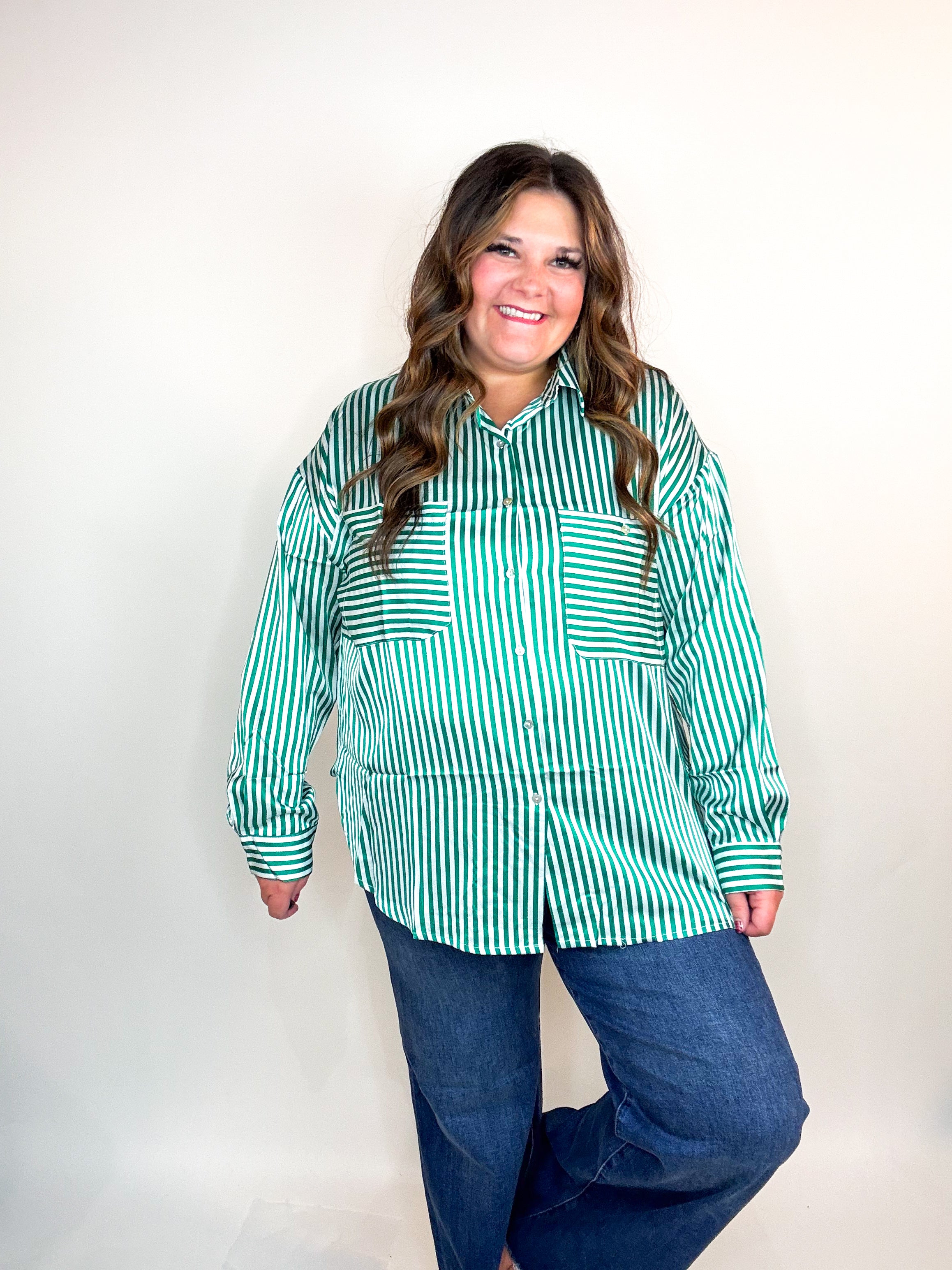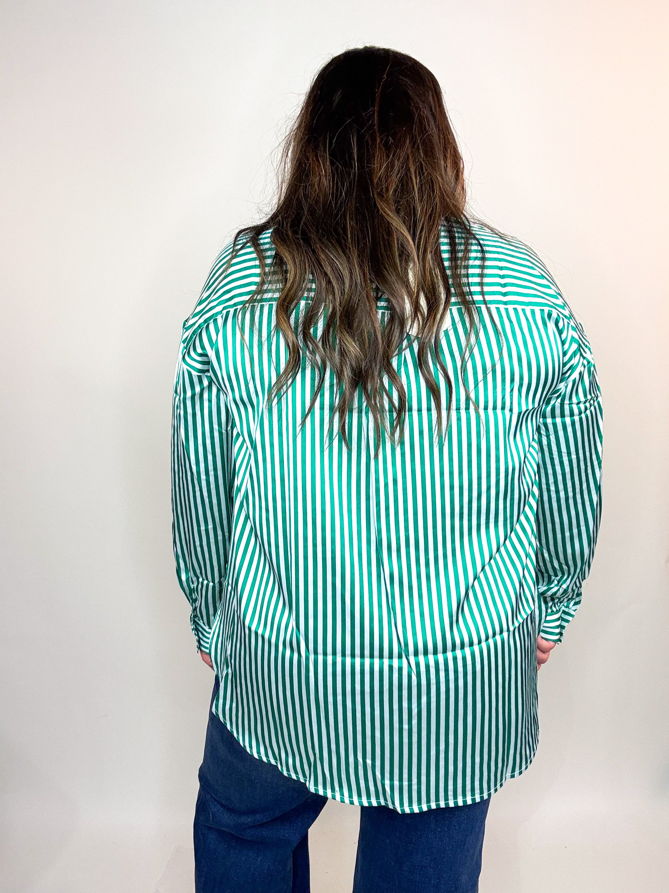 💚✨ Add a pop of festive color with this gorgeous green and white striped button-up! This top is lightweight, relaxed, and effortlessly stylish — giving you that perfect blend of comfort and class. 🌿 The crisp stripes and flattering oversized fit make it a must-have piece for the season and beyond.